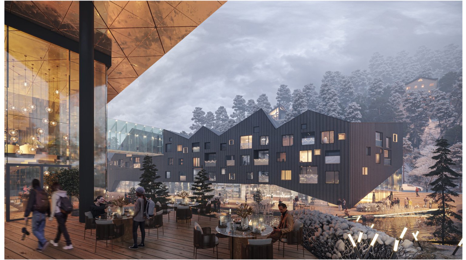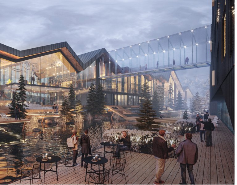 Concept study for a multifunctional hub as the new heart in the main Ukrainian ski restort in the village of Polyanytsya, Ivano-Frankivsk region. Gross area appr. 10.500 m2.