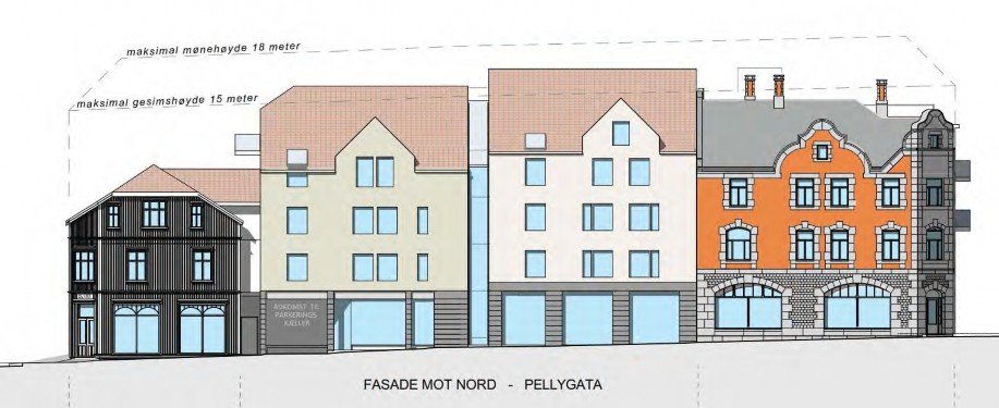 Pellygata 74-78, Glengsgata 29 in Sarpsborg - mixed use development with residental and commercial spaces. The areaplan was prepared in collaboration with Liefting Arkitektur og Restaurering and was approved 3.3.2022.